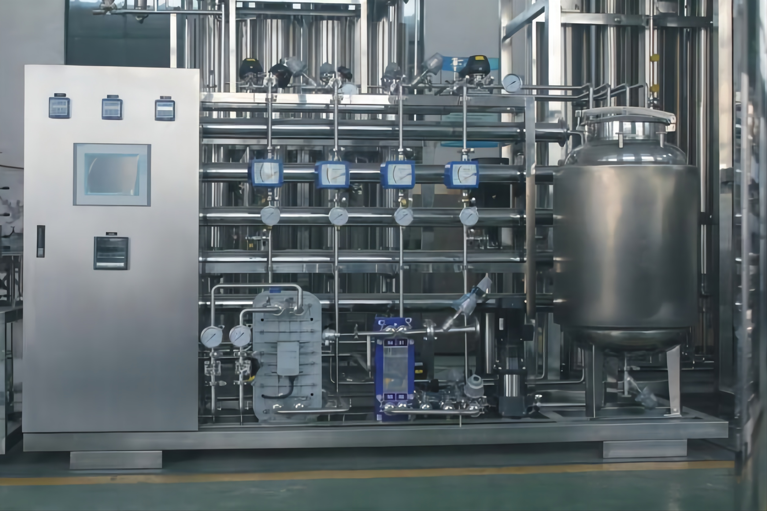 ②工藝:預(yù)處理系統(tǒng)→一級(jí)高壓泵→一級(jí)RO反滲透→級(jí)間純水箱→二級(jí)高壓泵→二級(jí)RO反滲透→二級(jí)純水箱→EDI輸送泵→EDI電除鹽系統(tǒng)→無(wú)菌純水箱。